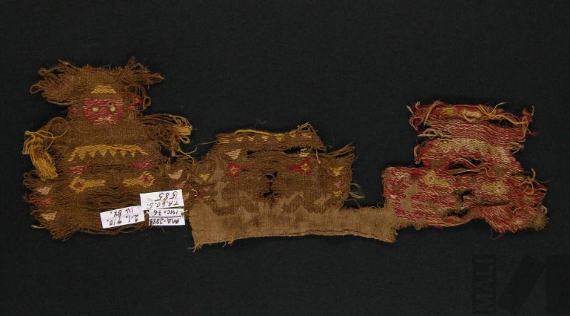Fragmento de paño polícromo con personaje antropomorfo con tocado y diseños zoomorfos de perfil con tocado