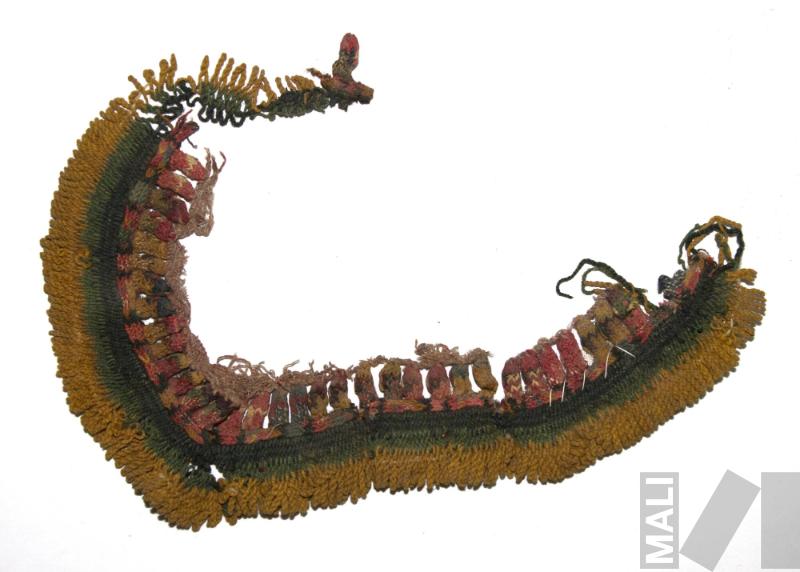 Adorno tridimensional con representaciones ornitomorfas, fitomorfas y flecos a lo largo de la pieza