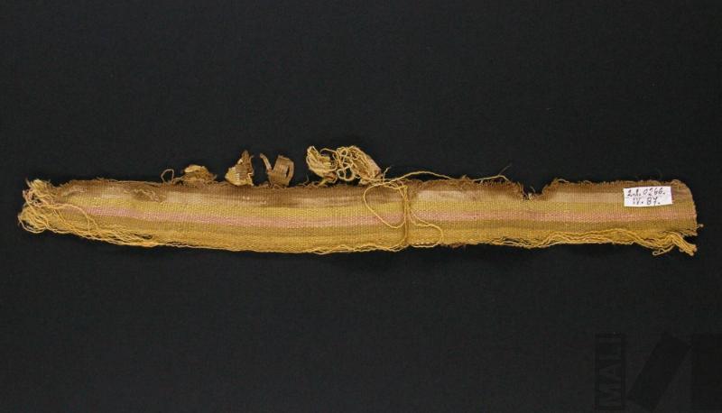 Fragmento de paño polícromo con diseños geométricos en flecos y diseños de listas horizontales