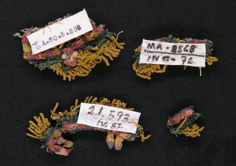 Adorno tridimensional con representación fitomorfa. Presenta flecos