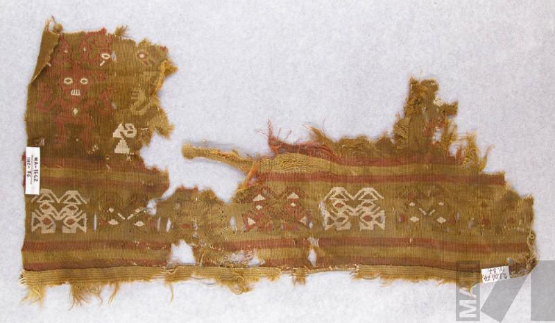 Fragmento de paño polícromo con diseños dde aves y personaje antropomorfo